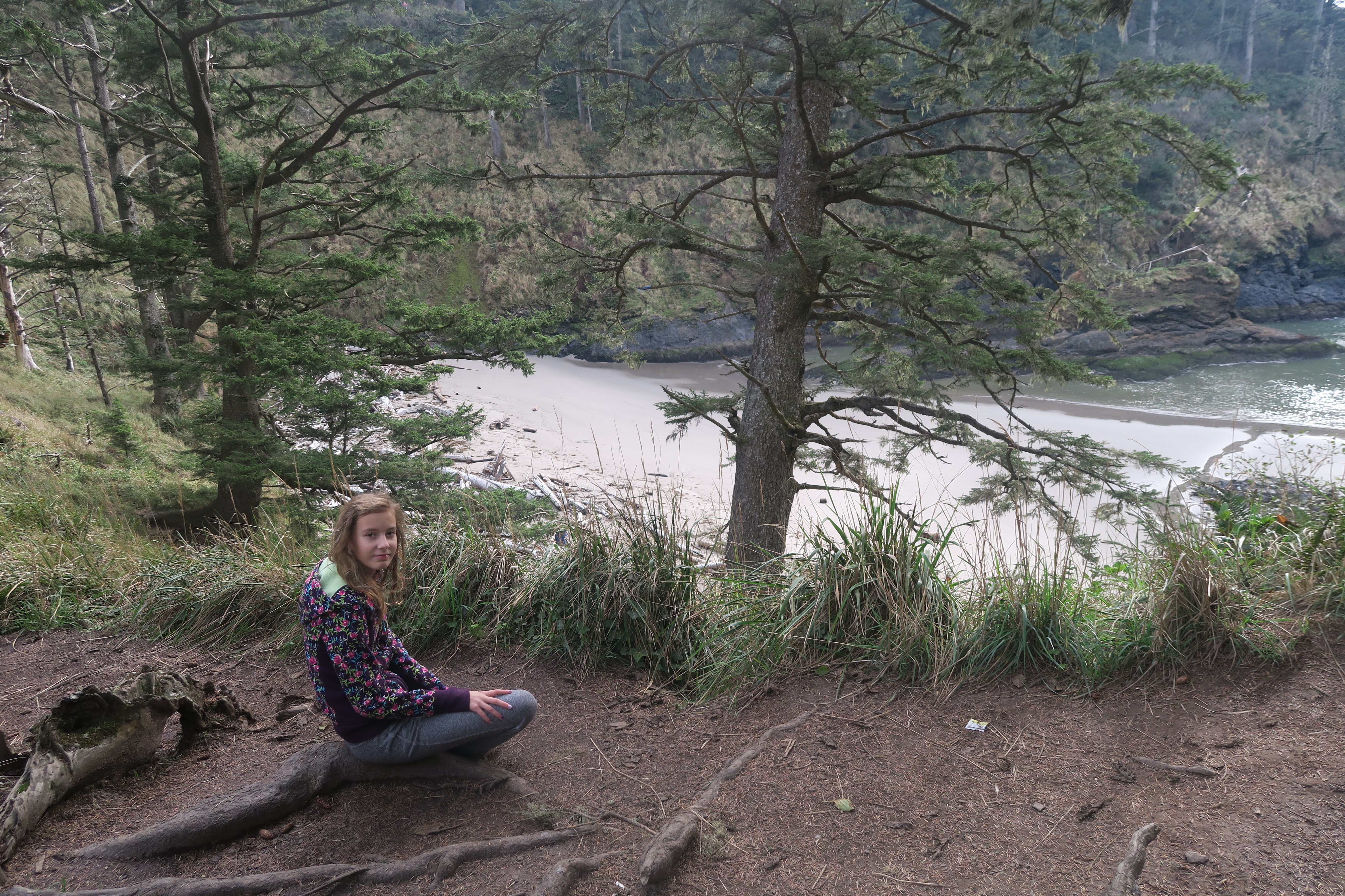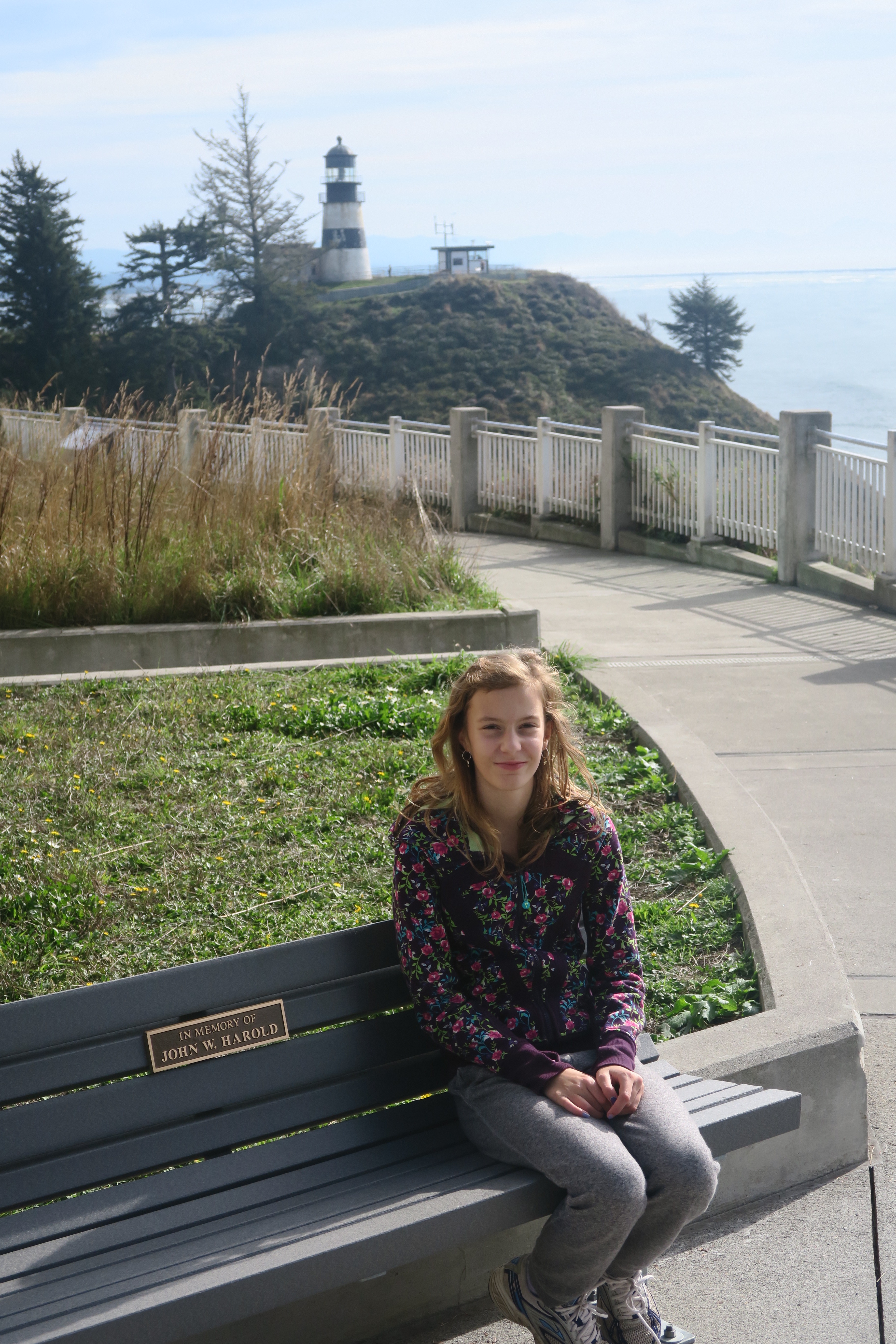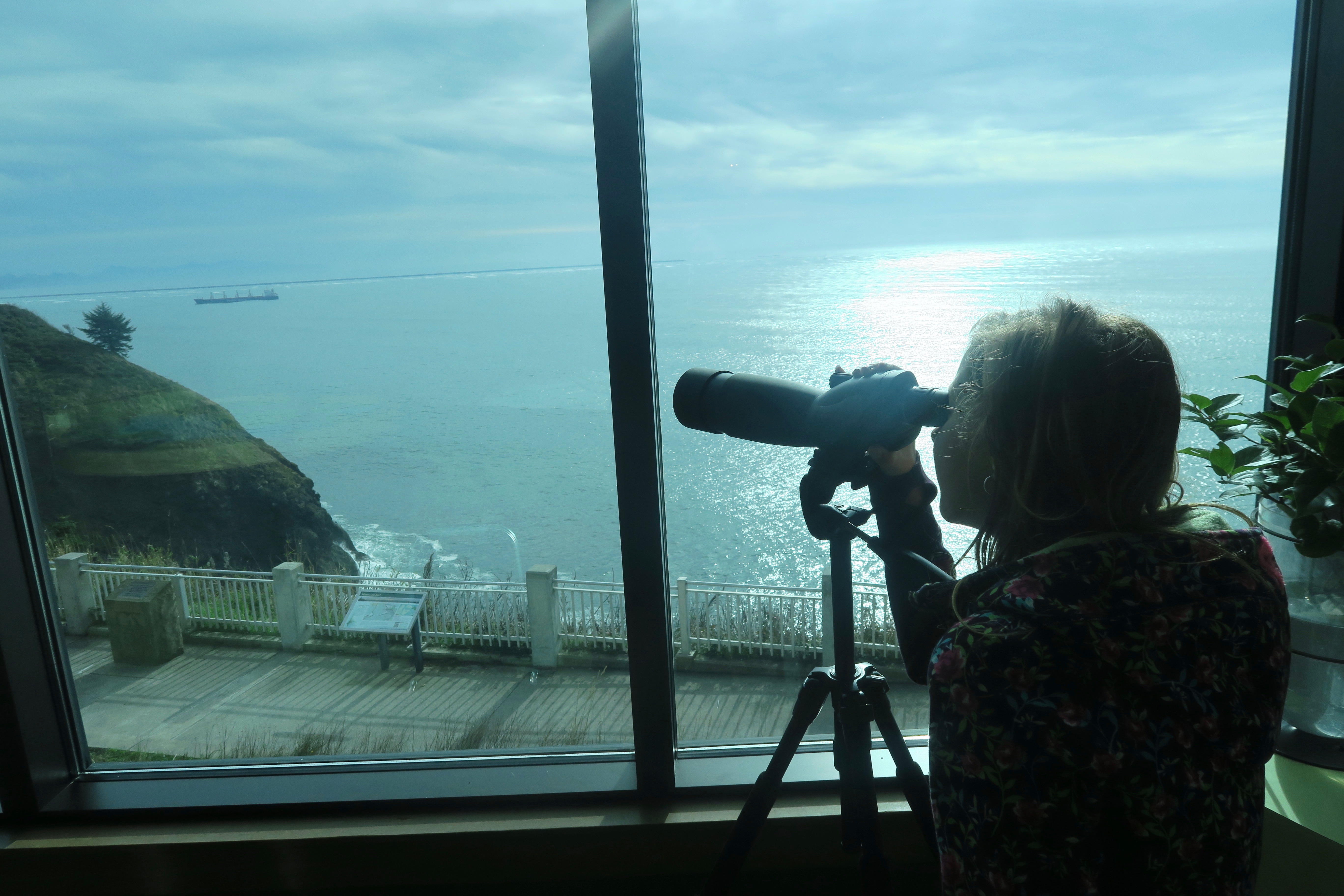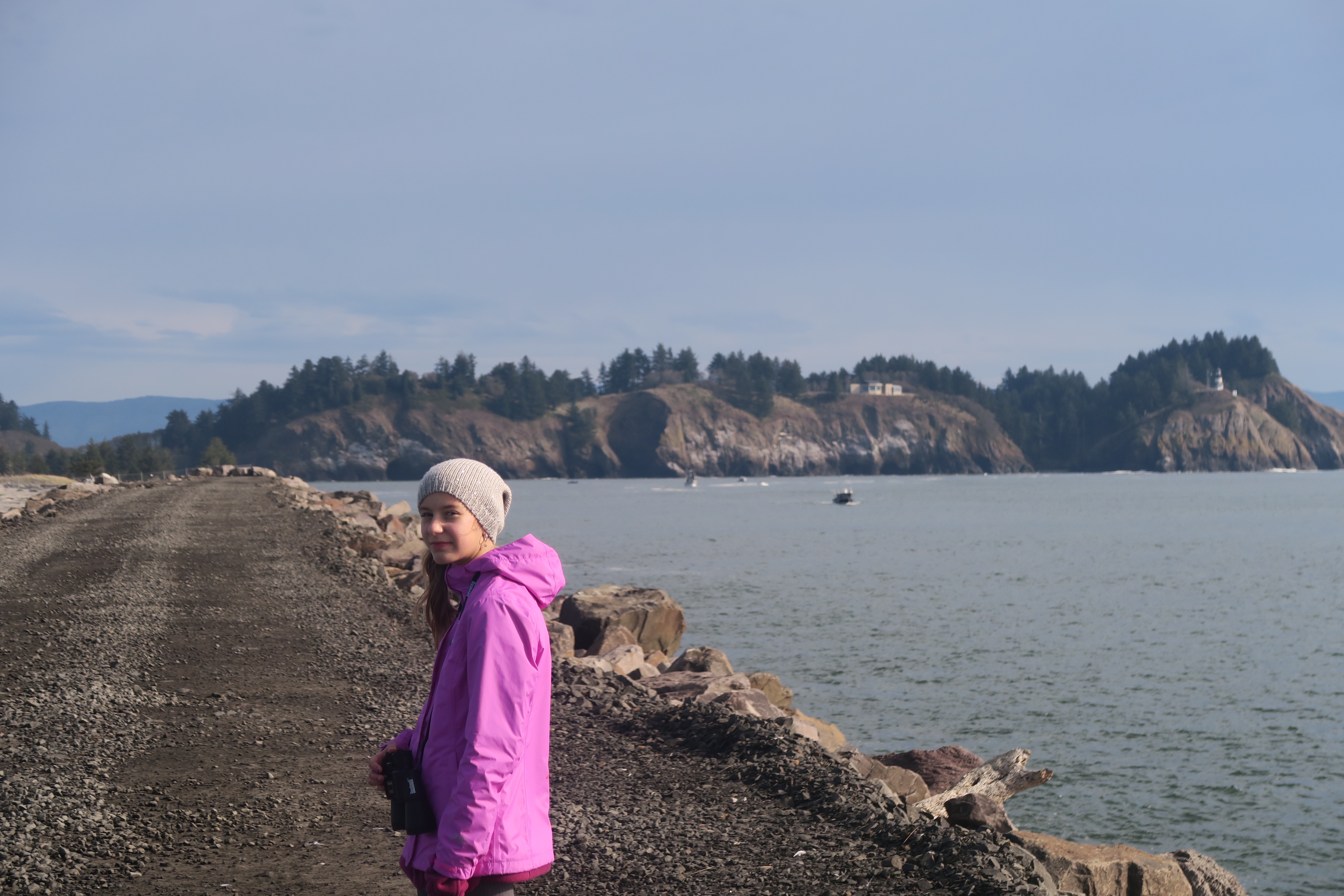 Maddie looking out at the Columbia River and Pacific Ocean confluence. You can see the southern jetty in the distance.