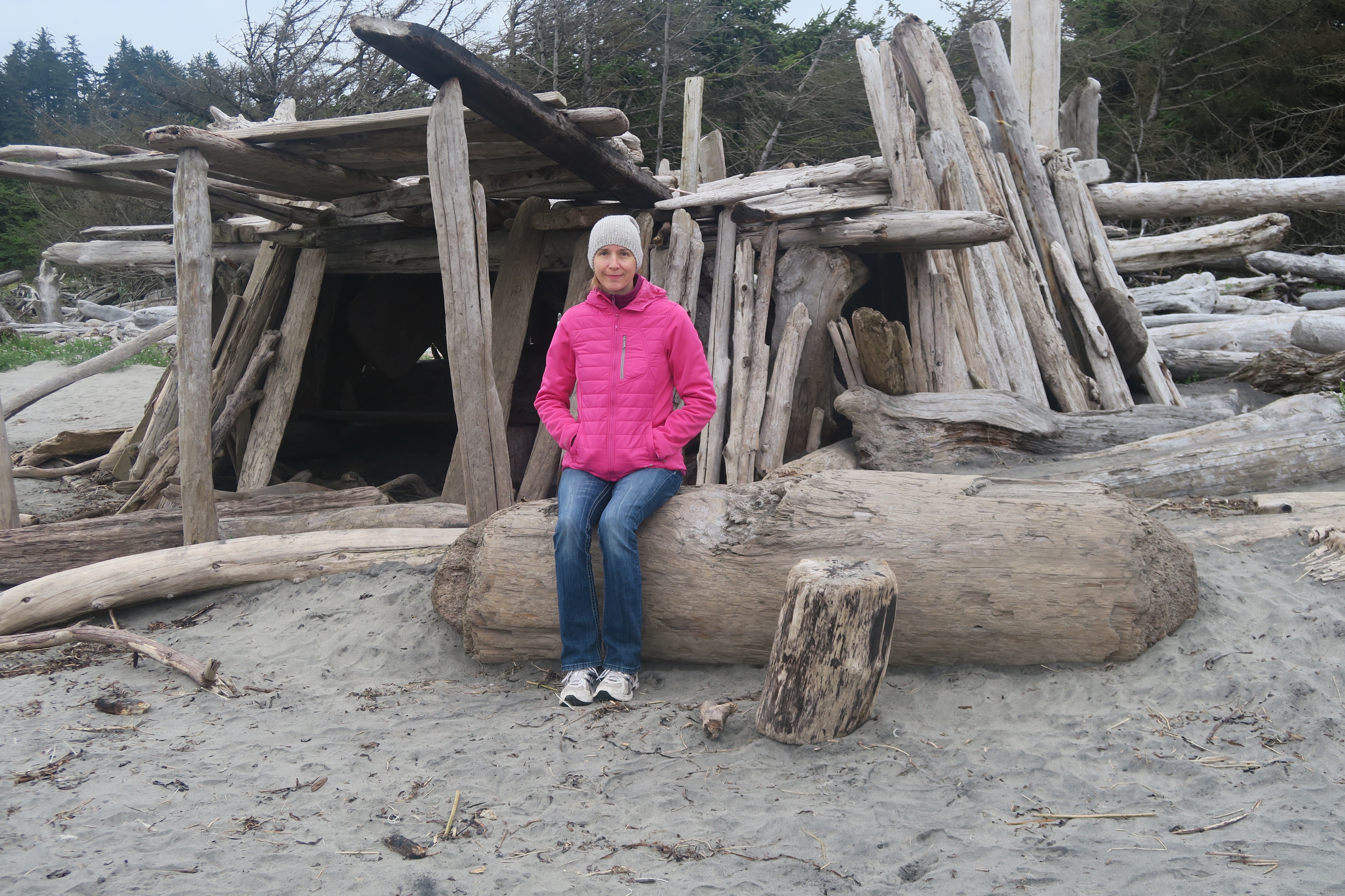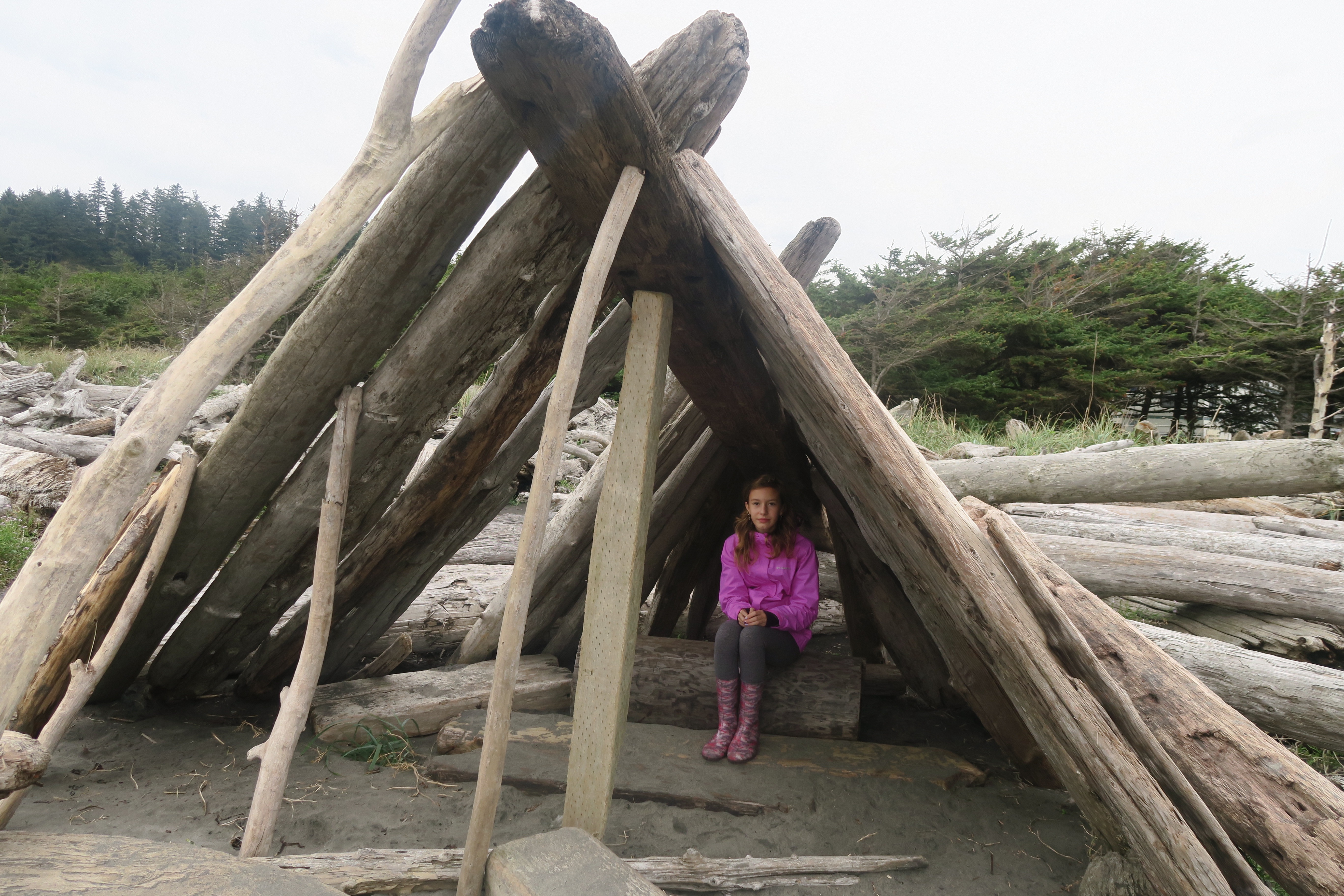 There are lots of driftwood forts along the beach. Some had seating inside. This one had a front porch. Too fun!