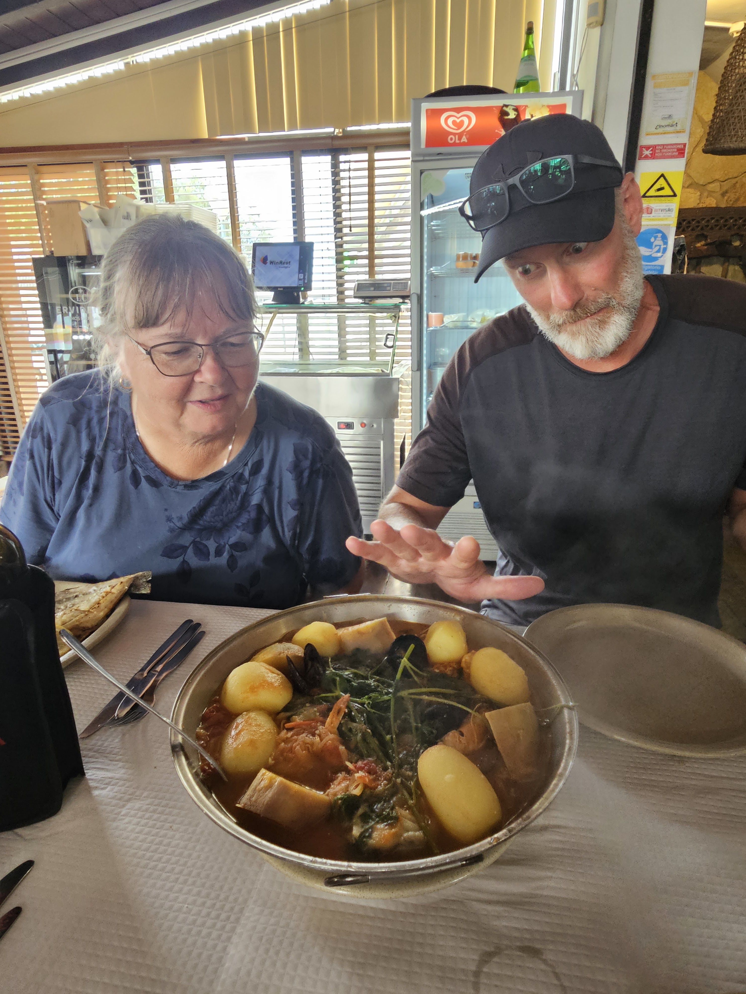 A cataplana is an item of cookware used to prepare Portuguese seafood dishes, popular in the country’s Algarve region. Not sure if Bob is just really hungry or surprised at the size of the meal! Haha